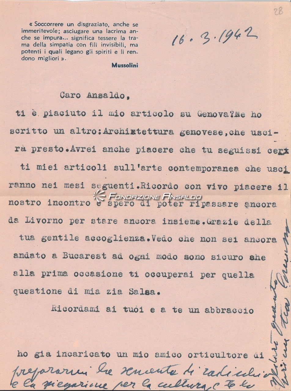 Lettera di Giovanni Comisso inviata a Giovanni Ansaldo, 16 - 3 - 1942